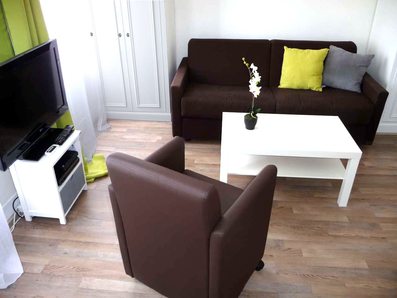 L'appartement L'appartement est un studio de 27 m² (loi Carrez) rénové et redécoré en 2012, aménagé pour 2 personnes. Il se trouve au 5ème étage d'un immeuble ancien du XVIIème siècle. L'accès est sécurisé par un digicode protégeant la porte sur la rue et un interphone (ou clé) pour ouvrir la porte intérieure donnant sur l'escalier d'époque (il n'y a pas d'ascenseur). L'entrée de l'immeuble a été rénovée et présente de belles pierres et poutres apparentes. Le séjour Le séjour est lumineux avec 2 hautes fenêtres donnant sur la rue.