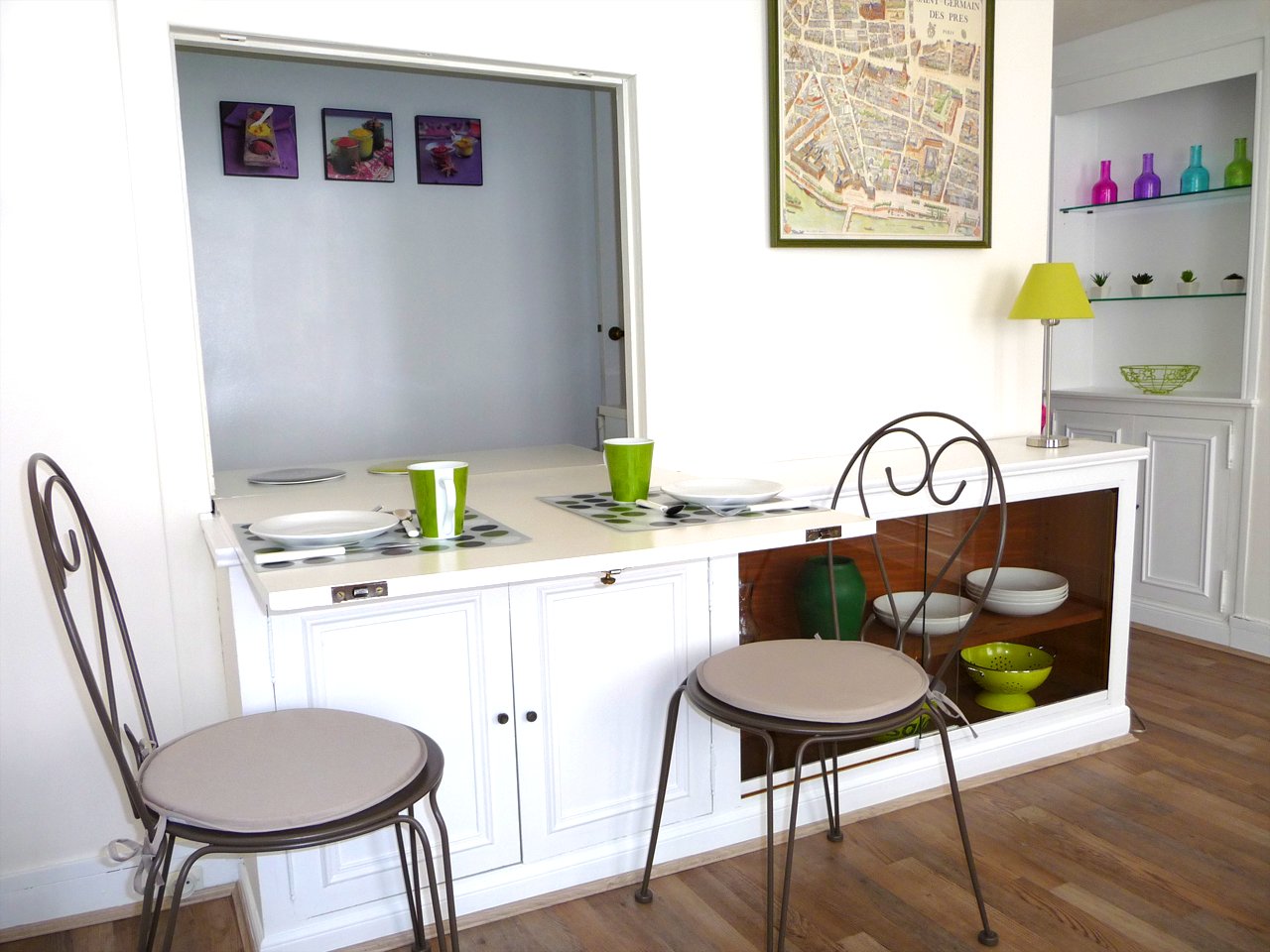 large panneau abattant peut s'ouvrir sur la cuisine et se transforme en