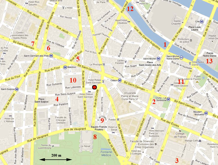 Le Quartier Latin Le Quartier Latin s'étend sur la rive gauche du fleuve de Saint-Germain-des-Prés au Panthéon, de la Seine au jardin du Luxembourg, à cheval sur les 6ème et 5ème arrondissements de Paris. C'est le quartier des lycées prestigieux, des grandes écoles et des facultés oû l'enseignement se faisait autrefois exclusivement en latin. Les ombres de Jean-Paul Sartre, Boris Vian et Miles Davis y rôdent encore pour évoquer les heures légendaires de l'après-guerre à Saint-Germain-des-Prés. Les restaurants gastronomiques, les enseignes de notoriété mondiale et les boutiques de luxe côtoient les cafés avec terrasse, les bistrots populaires et les cinémas. C'est aujourd'hui l'un des endroits les plus recherchés et les plus chers de Paris. La vie y est animée le jour et la nuit et on y croise des étudiants, des professeurs mais aussi des artistes, des professions intellectuelles et des touristes de tous les pays... Vous êtes bien au coeur de Paris ! |