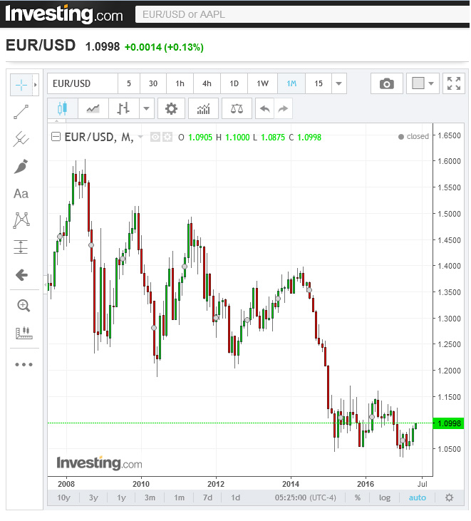 ________________________ Currencies € / $ 2008-2017 And if you are using USD (US $), you must know it is an excellent time to buy in the EEC since the Euro is at a 9 years low (see below). It is about 30 % off compared to 2008 ! |