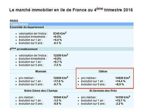 Odéon area (€ per sqm) (source: "notaires" of Paris, real sales 4th trimester 2016) Other districts see here