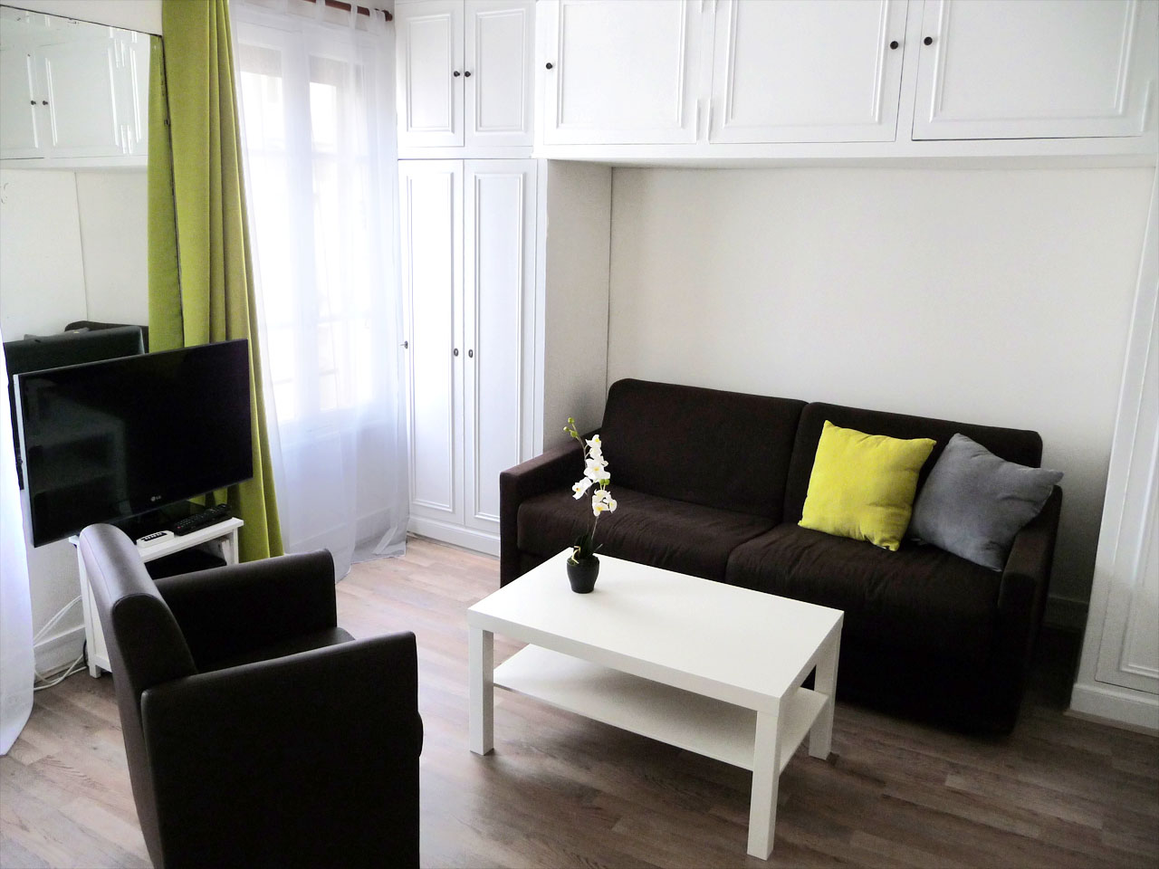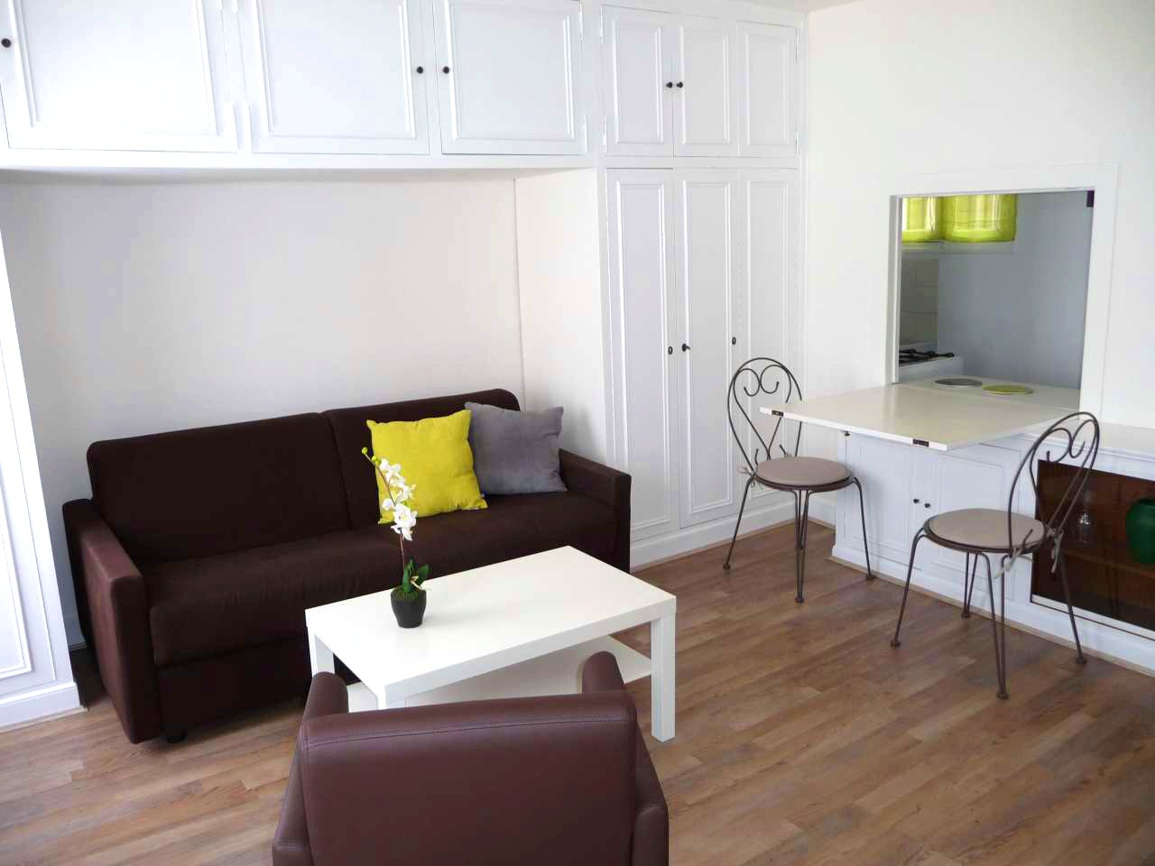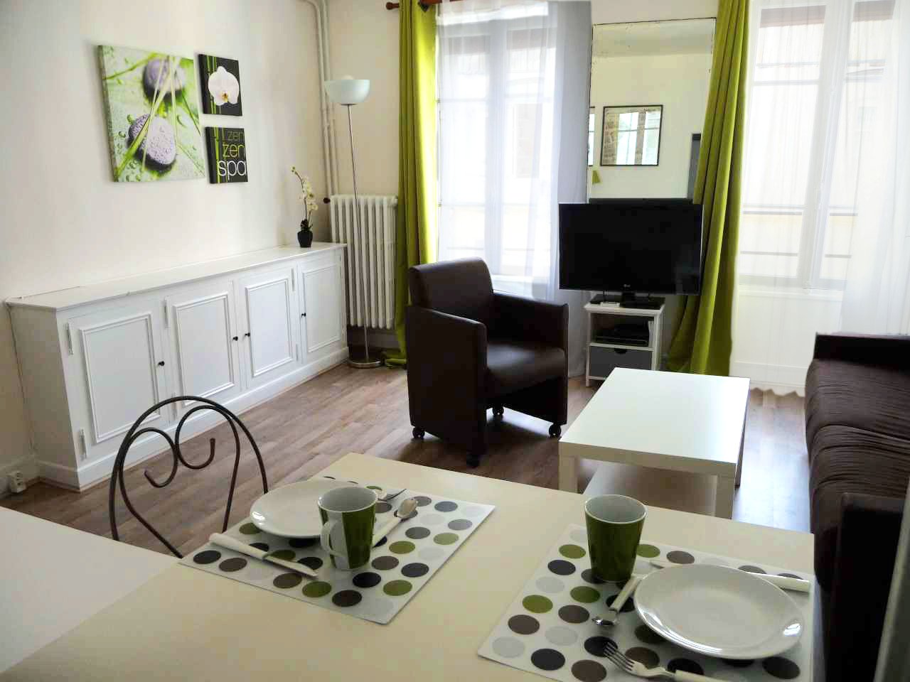 L'appartement L'appartement est un studio de 27 m² (loi Carrez) rénové et redécoré en 2012, aménagé pour 2 personnes. Il se trouve au 5ème étage d'un immeuble ancien du XVIIème siècle. L'accès est sécurisé par un digicode protégeant la porte sur la rue et un interphone (ou clé) pour ouvrir la porte intérieure donnant sur l'escalier d'époque (il n'y a pas d'ascenseur). L'entrée de l'immeuble a été rénovée et présente de belles pierres et poutres apparentes. Le séjour Le séjour est lumineux avec 2 hautes fenêtres donnant sur la rue.